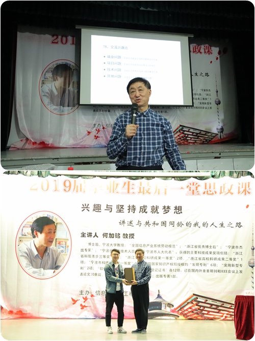 广受师生好评的德高望重的老教师,师生都尊称他为“何伯”。在这最后一堂思政课上,何老师从自身的家庭求学经历说起,和学生们分享了成长过程中包括插队的趣事,讲述了在宁大就职期间的学科发展情况,科研经历,学科产业化的情况。介绍了退休后开始创业的经历,定位客户需求结合市场前景开展项目的研发。最后何教授寄语所有毕业生,做事要有态度,坚持有兴趣的初心梦想,带有积极的态度乐观生活。现场的毕业生受益匪浅。