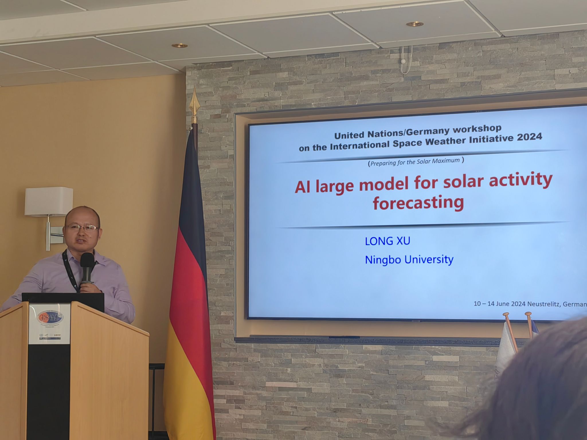 在此次会议上,徐龙教授发表了题为“AI large model for solar activity forecast”的大会特邀报告。徐龙教授在报告中指出:“在太阳活动极大年,耀斑、日冕物质抛射等爆发事件频发,对地球空间环境、卫星通信、导航系统及电力网络等构成潜在威胁,因此准确预报太阳活动成为保障人类活动安全的重要课题。”该团队最新研发的一项综合所有太阳活动智能化处理任务而构建的太阳活动预报统一AI大模型采用深度学习算法对海量太阳观测数据进行高效处理与分析,实现了全时空、宽频段、多模态太阳观测数据的交叉验证和互补,实现了太阳耀斑、日冕物质抛射、太阳风等关键空间天气事件的精准预报,这一研发成果不仅提高了太阳活动预报的准确性和时效性,还为空间天气预报和灾害防范提供了强有力的技术支持,展示了AI与科学交叉研究的巨大潜力和前景,引发了与会专家学者的高度关注与广泛好评。