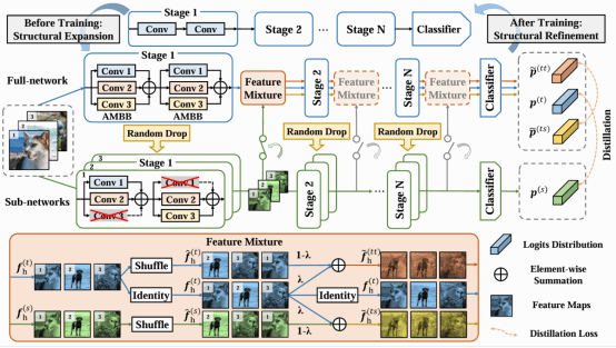 该论文主要研究内容集中在通过自蒸馏(Self-Distillation)技术重新构建教师网络和学生网络的结构。研究团队提出了一种基于网络重参数化的子网络自蒸馏方法,旨在提高模型在图像分类任务和密集预测任务(如目标检测和语义分割)上的性能。通过实验,作者们展示了他们的方法能够在保持模型大小不变的情况下,提高模型的准确率。