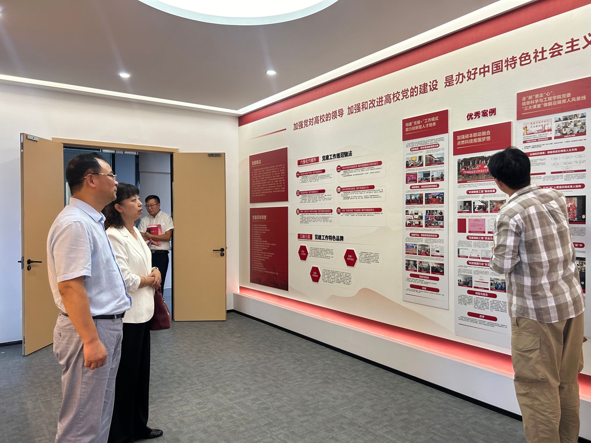 党建文化实体阵地“二家二廊”,即教工活动小家、党员之家、学院党建育人文化长廊等地。双方通过参观交流进一步达成了党建凝心、文化育人的共识,希望接下去的工作中能够继续发挥两家院校的优势经验,互通有无,接续共进。
