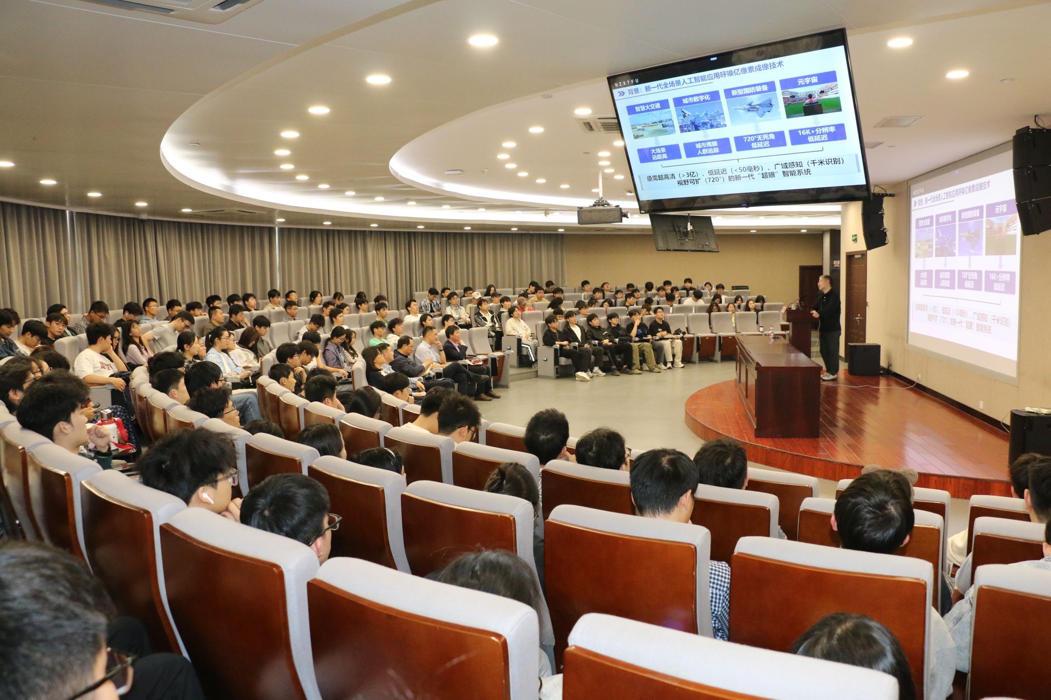 曾晓洋教授在报告中指出,随着新一代人工智能技术的发展,全场景智能应用对视觉感知系统提出了更高要求,亟需具备超高清(>3亿像素)、低延迟(<50毫秒)、广域感知(千米级识别)和视野可扩展(720°)能力的"超眼"智能系统。然而,现有技术面临三大核心挑战。成像方法:亿级像素视频的实时采集与显示存在技术瓶颈;视频计算:缺乏支持亿级像素的高效计算架构;AI部署:跨层次协同的AI模型优化难题亟待解决。针对上述挑战,曾晓洋教授团队实现三大技术突破:多源多尺度视频拼接融合计算成像方法、毫秒级延迟视频专用硬件处理器,以及端边协同分布式智能工具链。相关研究成果已达到国际先进水平,并在城市高空监测、建筑工地安全监控、港口水域环境监测及野外灾害预警等领域成功应用,为智慧城市建设提供了重要技术支撑。