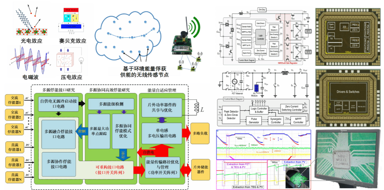 针对低功耗物联网微电子设备能量可靠供应的需求,围绕多源环境能量俘获系统“俘得进”、“传得好”、“供得起”等若干关键科学问题,开展了高效环境能量俘获方法与集成电路系统关键技术研究。在多源能量俘获系统的耦合建模及性能优化方面,建立了单源、多源复合俘能的理论模型及高效俘能方法,提出了环境微能量特征参数自适应的俘能技术,研制了光、热、振动等多源能量耦合的协作式俘能系统,研究成果发表在Applied Energy、Renewable Energy、Energy Conversion and Management等知名期刊上;在多源能量高效俘获接口电路创新研究方面,提出了宽输入、可扩展的自供能接口电路技术,突破了交直流、多频段、高压差多源能量俘获的关键技术,实现了时变环境能量的最大功率点跟踪提取,研究成果发表在IEEE Transactions On Industrial Electronics、IEEE Transactions On Power Electronics、Microelectronics Journal等顶级期刊上;在高能效多源能量俘获与管理集成电路设计方面,研制了基于多堆谐振的振动能、热能、电磁能等多源能量俘获与管理集成电路,实现了多源能量高效率集成化俘获,研究成果发表在IEEE Journal of Solid-State Circuits、IEEE Transactions On Circuits and Systems I: Regular Papers、IEEE Transactions On Circuits and Systems II: Express Briefs等权威期刊上。团队研发的多源环境能量俘获方法、结构、电路与系统等关键技术,获得国家发明专利授权20余件,研究成果获得了浙江省技术发明二等奖、宁波市科技进步一等奖和中国电子学会科技进步二等奖。技术成果可应用于自供能物联网节点、可穿戴式设备、地质灾害监测等领域,部分成果已获得转化应用,取得了良好的社会经济效益。