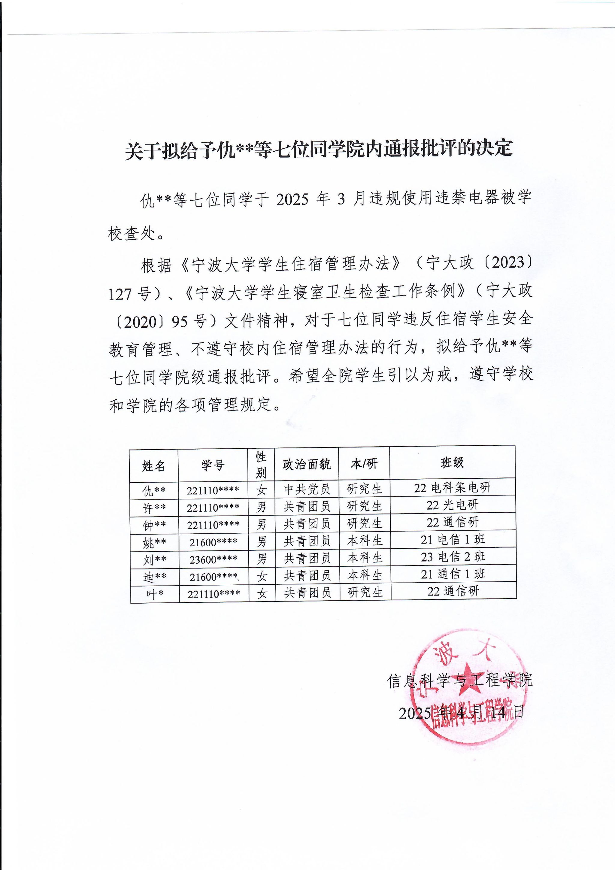 关于给予仇XX等7名同学院内通报批评的决定