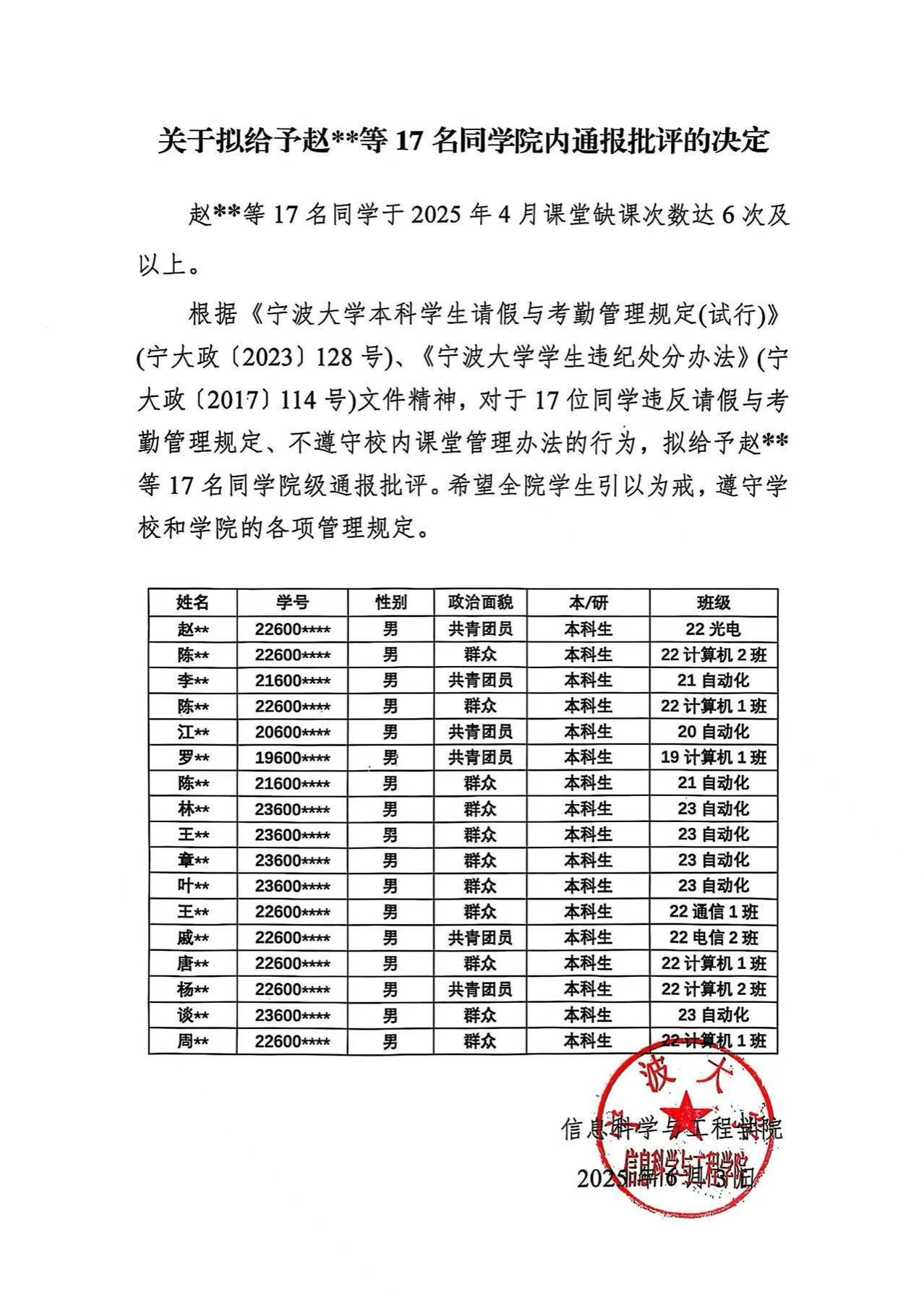 关于拟给予赵**等17名同学院内通报批评的决定