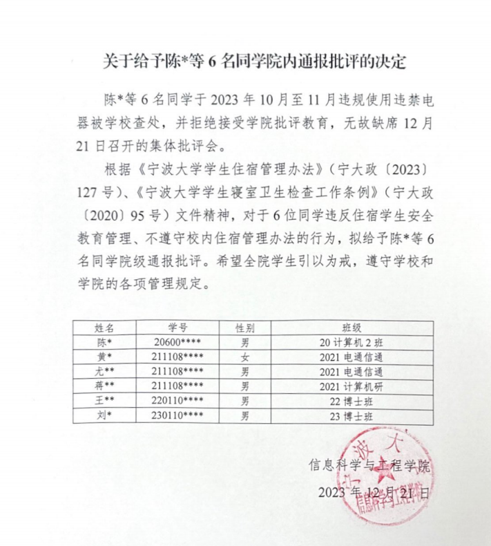 关于给予陈X等6名同学院内通报批评的决定